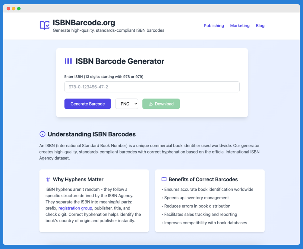 Create professional, print-ready ISBN barcodes with ISBNBarcode.org! This free, user-friendly tool delivers high-resolution EAN-13 barcodes, accurate hyphenation, and optional EAN-5 price codes, all powered by official ISBN Agency data.